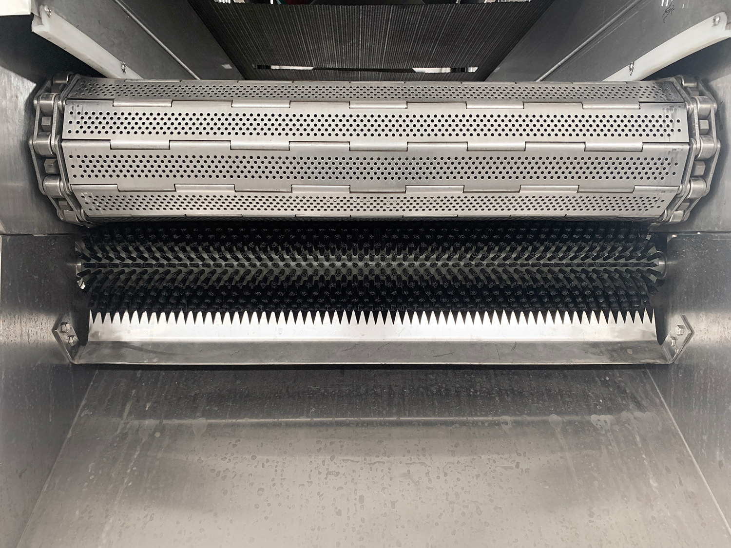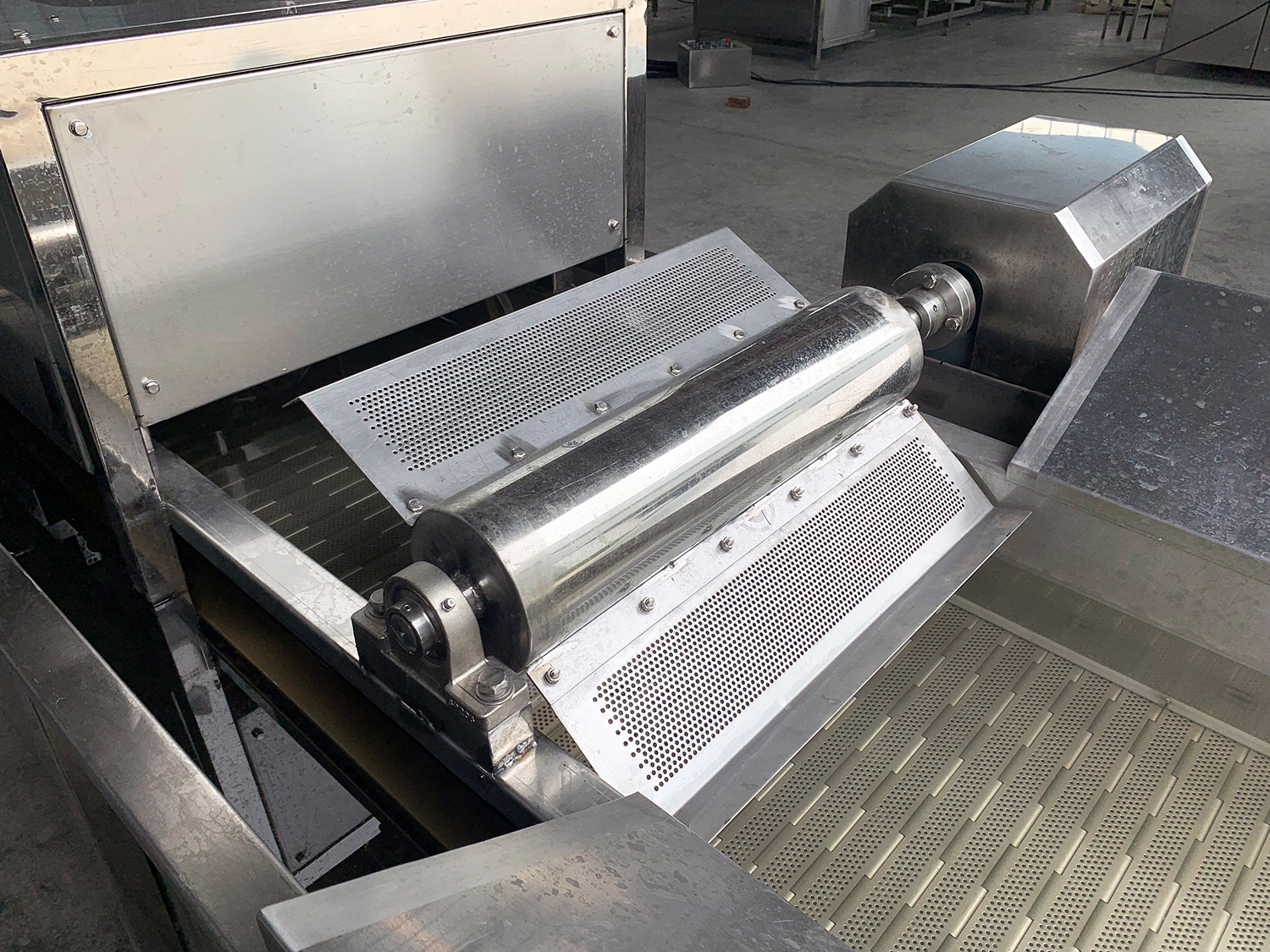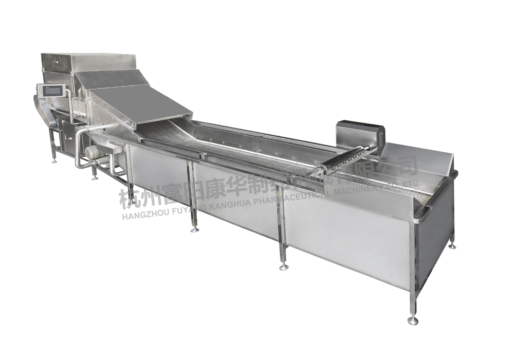 物料在網(wǎng)鏈輸送上運(yùn)動同時,純凈的高壓空氣在清洗槽的網(wǎng)鏈下產(chǎn)生強(qiáng)烈氣水泡,形成水浪,從而達(dá)到對中草藥等物料充分進(jìn)行清洗的目的。配套去雜去蟲機(jī)構(gòu),使漂浮物等隨水流從設(shè)備兩側(cè)流入到過濾網(wǎng)上,同時在物料輸出時在網(wǎng)鏈上方設(shè)有噴淋管,對物料進(jìn)行沖洗,可用作雙重清洗。