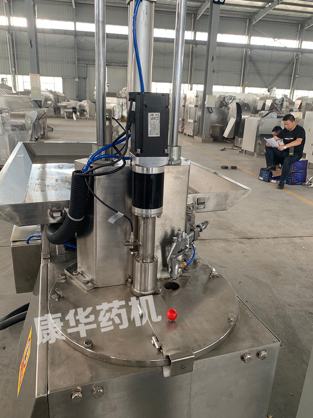 工作原理:將物料放入相應(yīng)進(jìn)料斗,氣缸自動壓料,切刀固定于轉(zhuǎn)盤正面,轉(zhuǎn)盤與切刀的合適間隙通過伺服電機(jī)控制刀盤上下調(diào)節(jié),當(dāng)電機(jī)帶動刀盤,將物料切成片狀。配有水槍噴霧裝置,使刀片切制藥材不容易粘刀,片形更好。